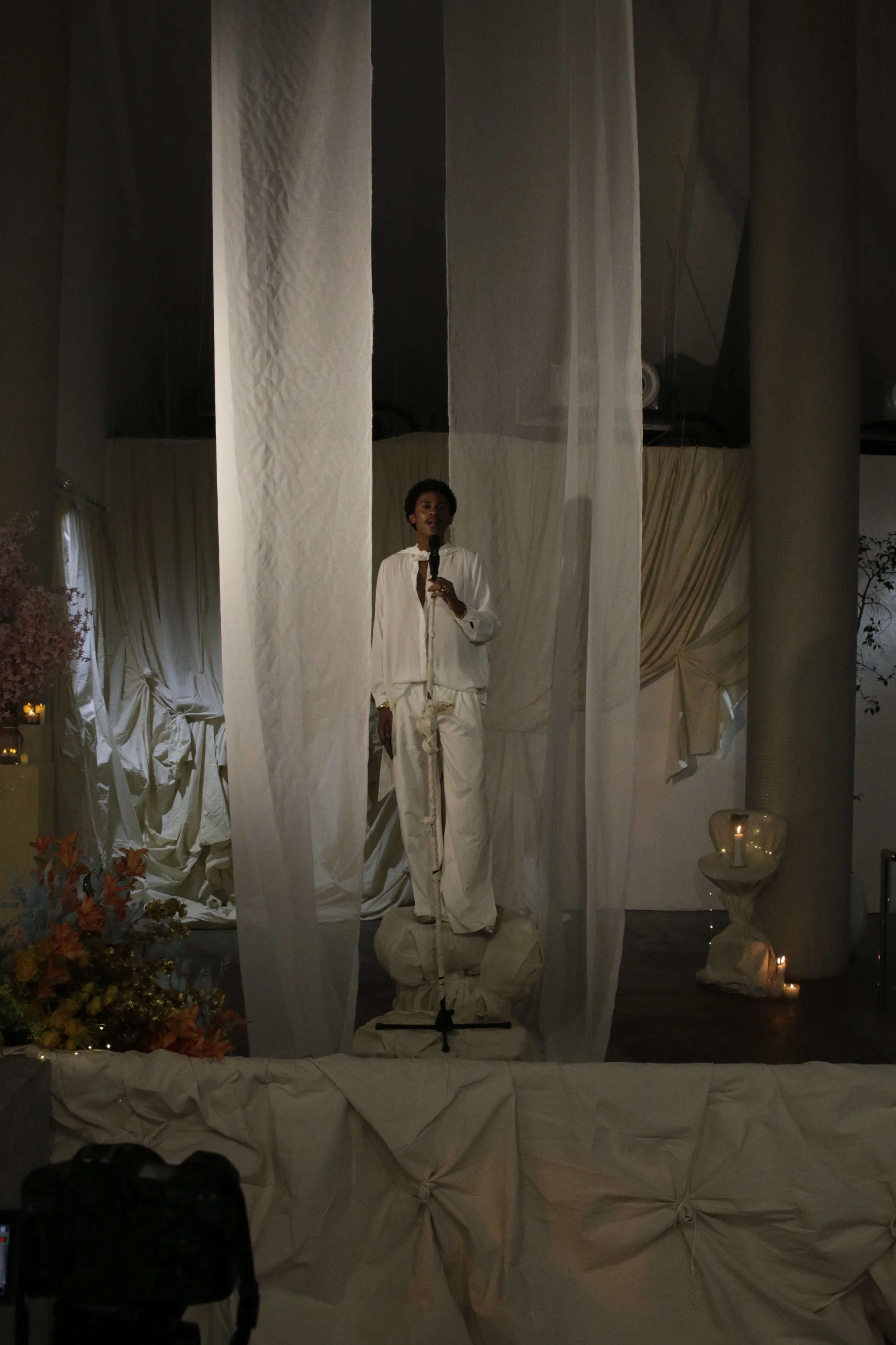 The studio transformed into a soft, cinematic space — blue lights glowing low, chairs and cushions carefully arranged for comfort, the air scented faintly with incense. Friends, collaborators, and supporters of AMAH gathered to bear witness to this story, and by extension, to the spirit of AMAH itself.